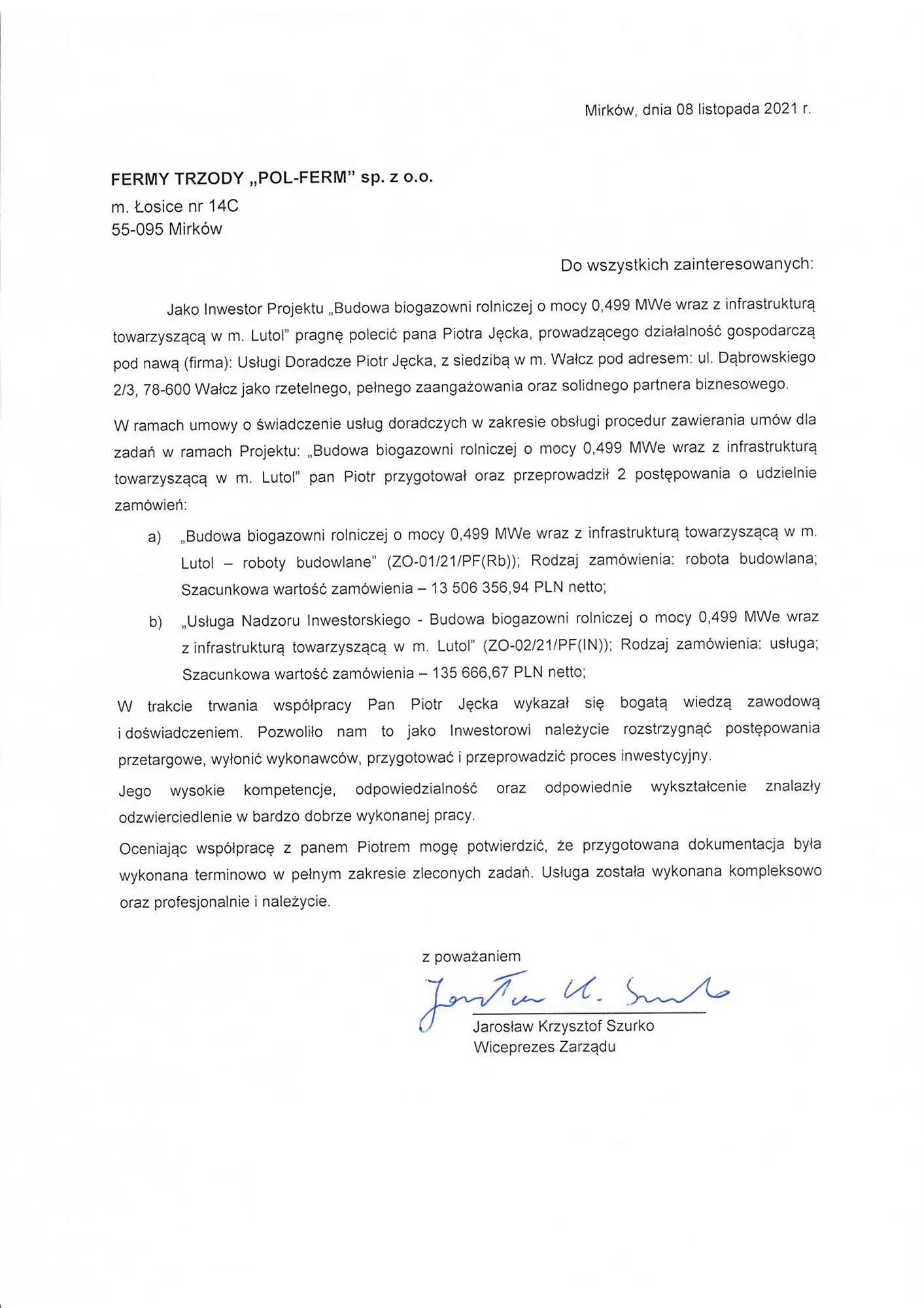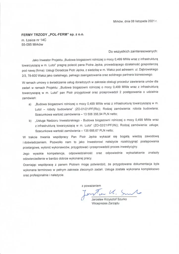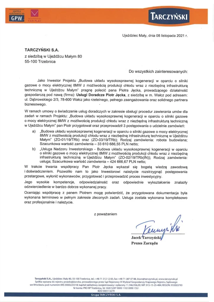 Poniżej prezentuję wybrane referencje od klientów, z którymi współpracowałem przy postępowaniach przetargowych oraz projektach finansowanych ze środków publicznych i unijnych. Dziękuję za okazane zaufanie – każda współpraca była dla mnie cennym zobowiązaniem i źródłem satysfakcji.